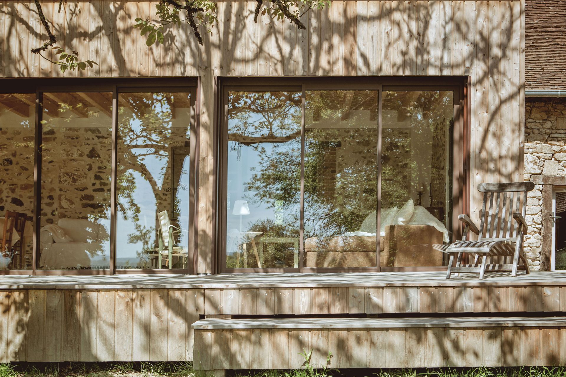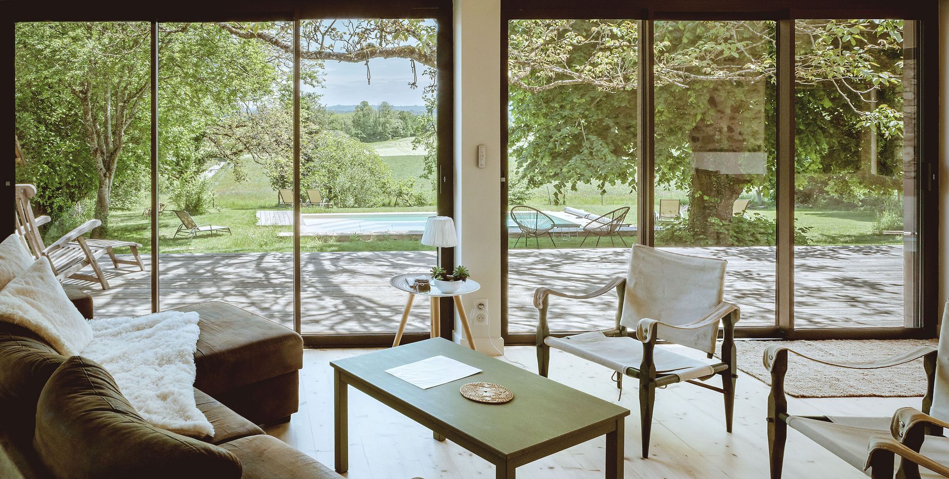 Les 47m2 de la pièce de vie donnent directement sur la verdure et sur la terrasse, endroit idéal pour se poser au lever du soleil !