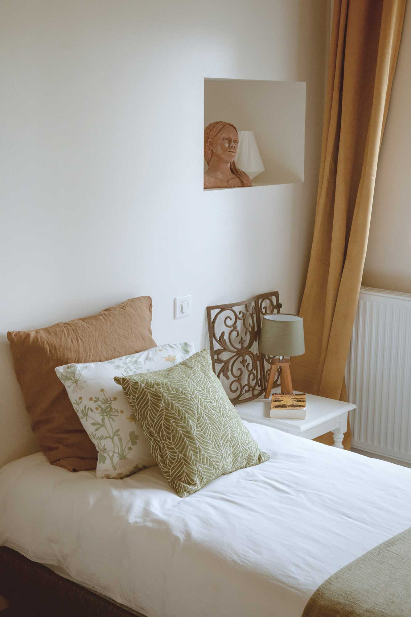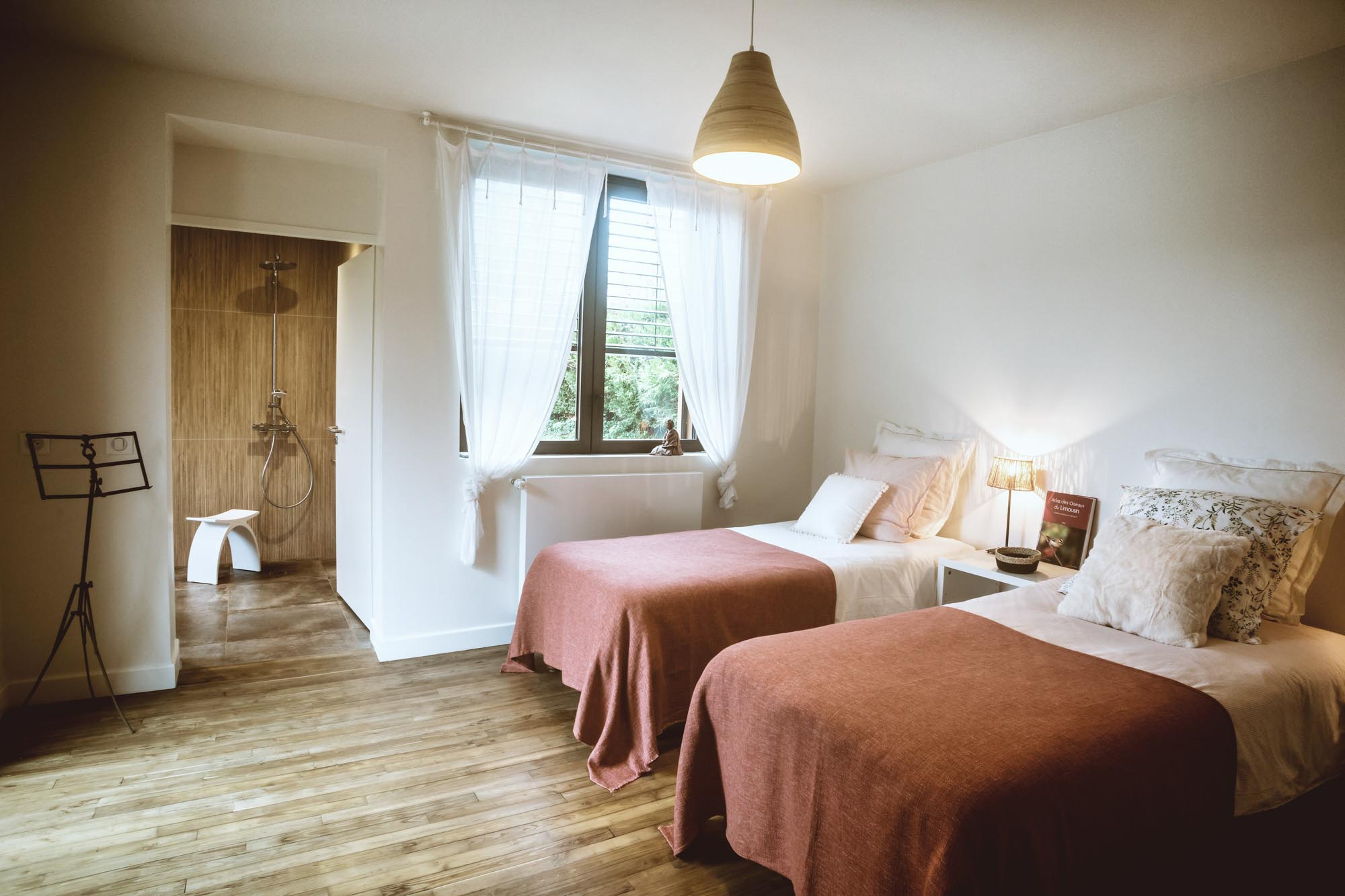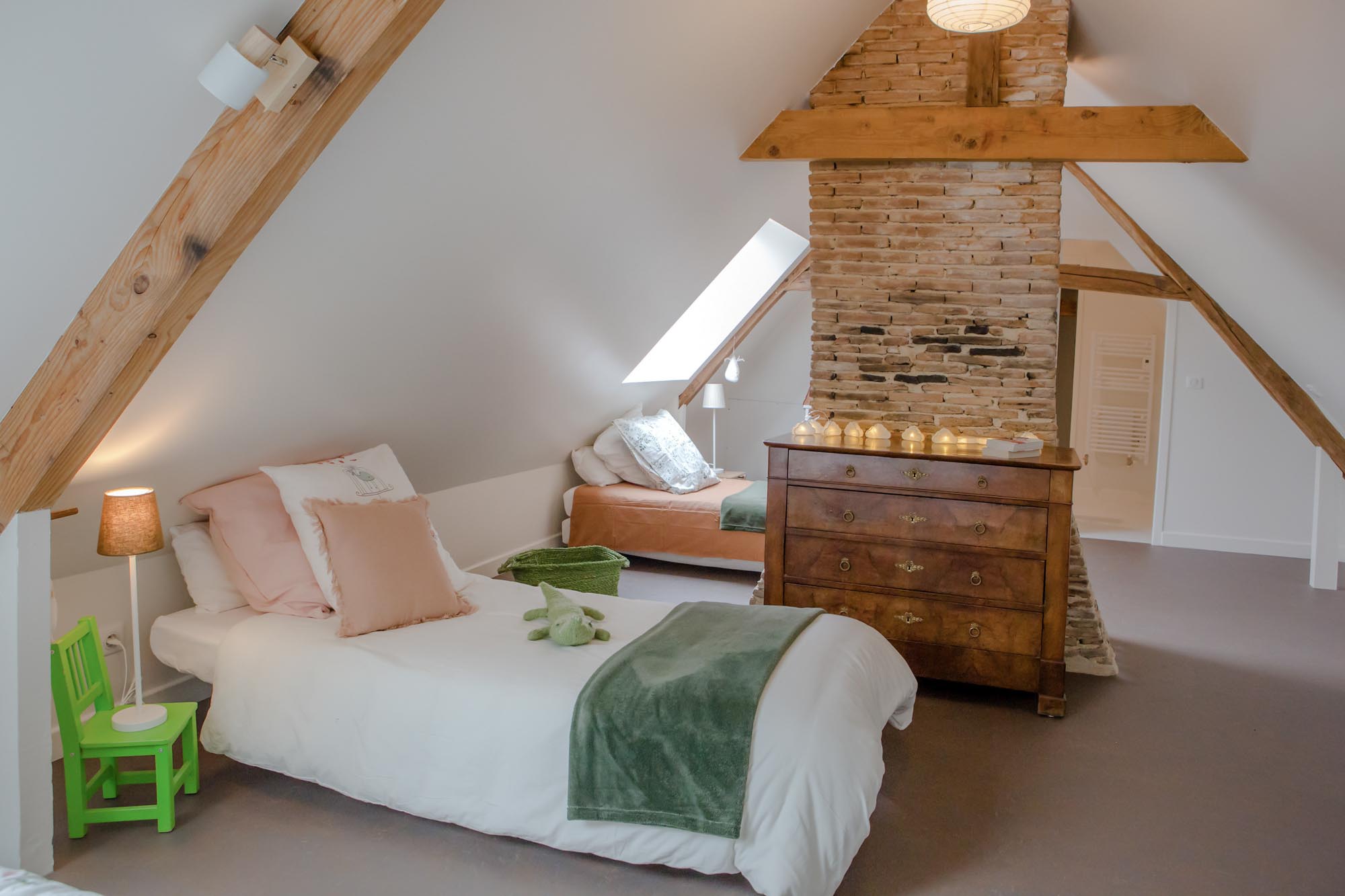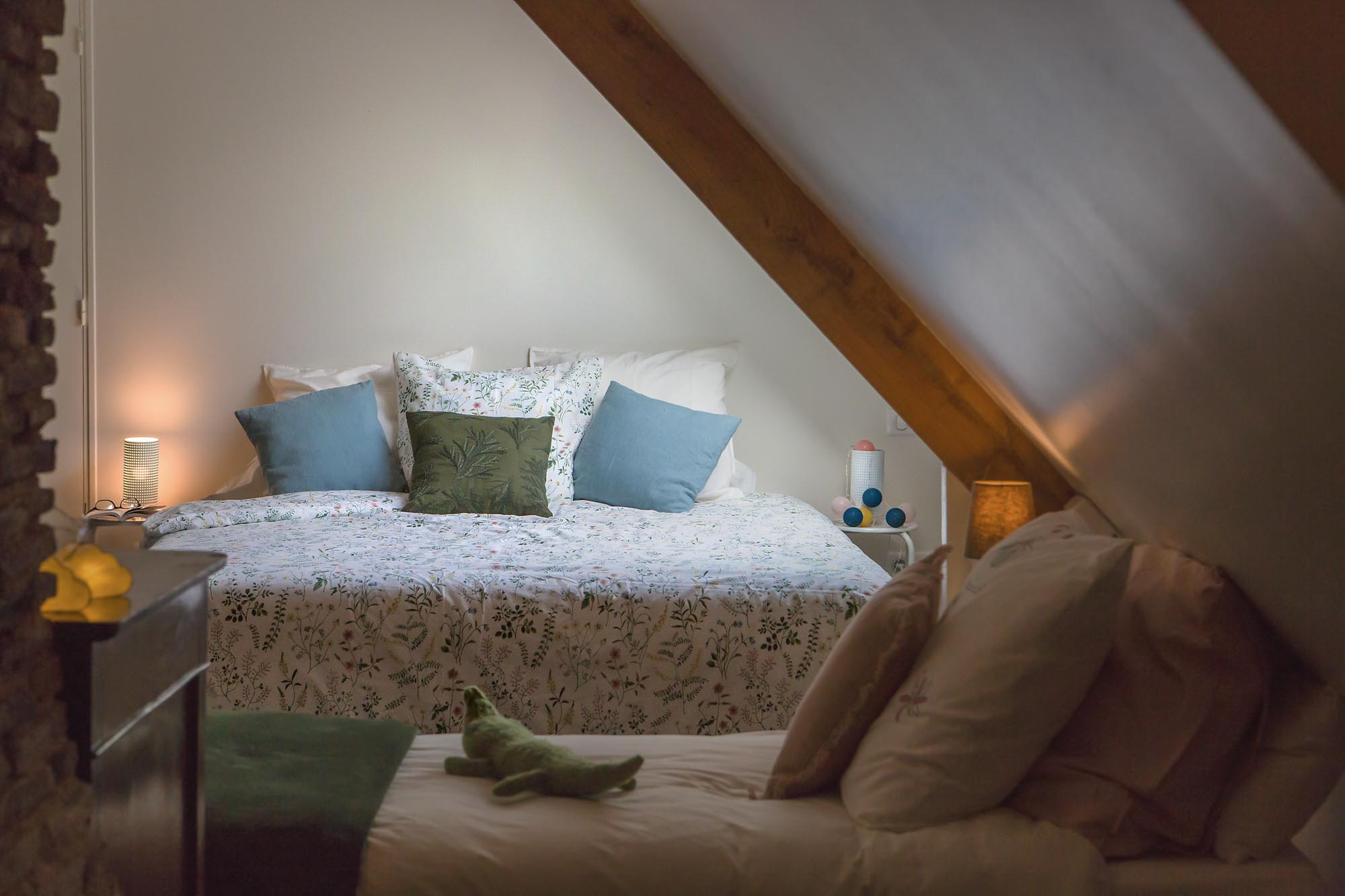 Les 4 chambres sont équipées de lits neufs que l'on rapproche - avec un système hôtelier - ou sépare selon les envies et les besoins de chacun.