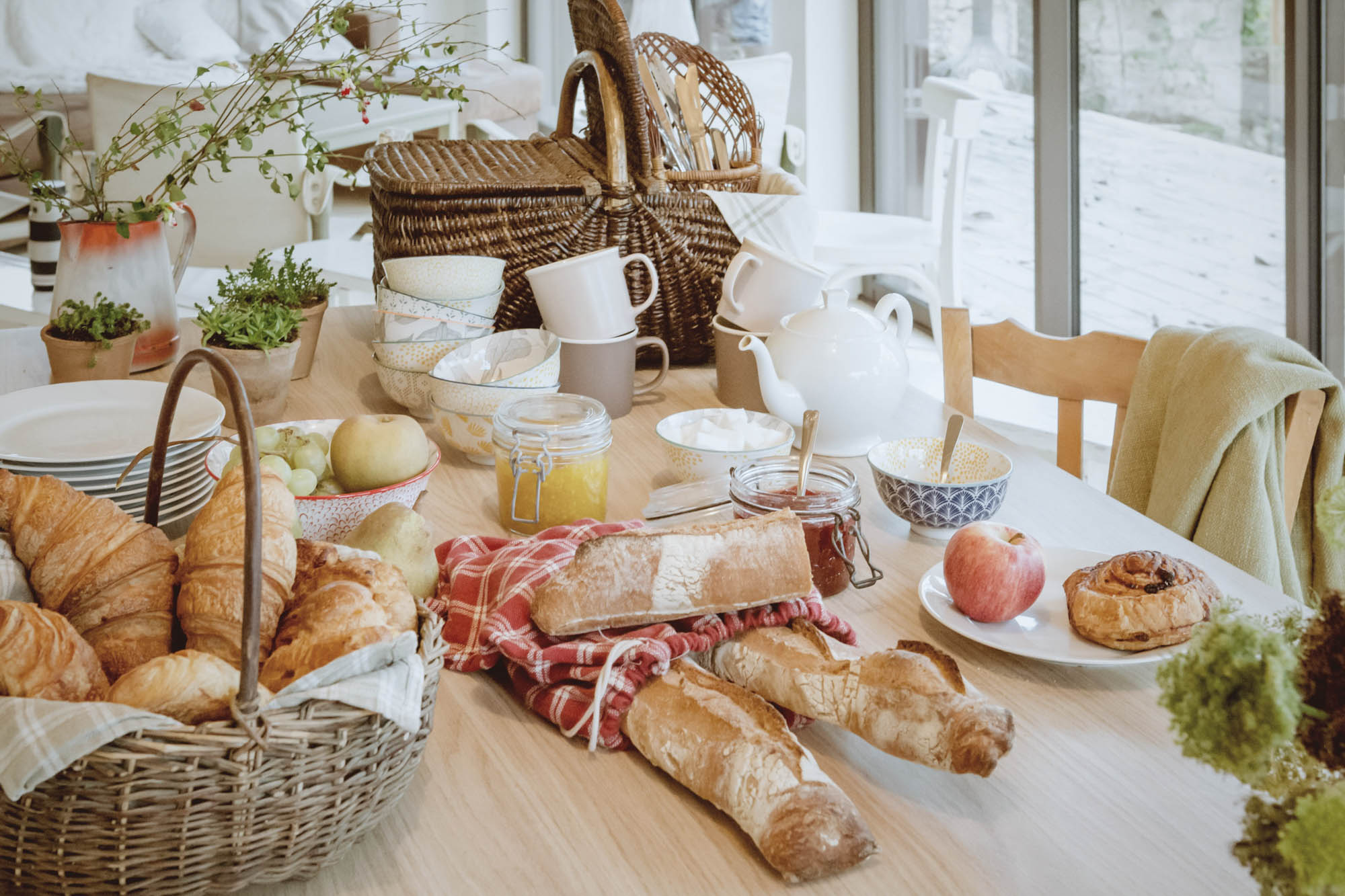 Livraison d'un panier petit déjeuner déposé devant le gîte à 8h30 pour que puissiez savourer viennoiseries et baguettes fraîches - façonnées par Hélène - la boulangère du village, accompagnées de beurre, de confiture, de fruits de saison et d'une boisson au choix.