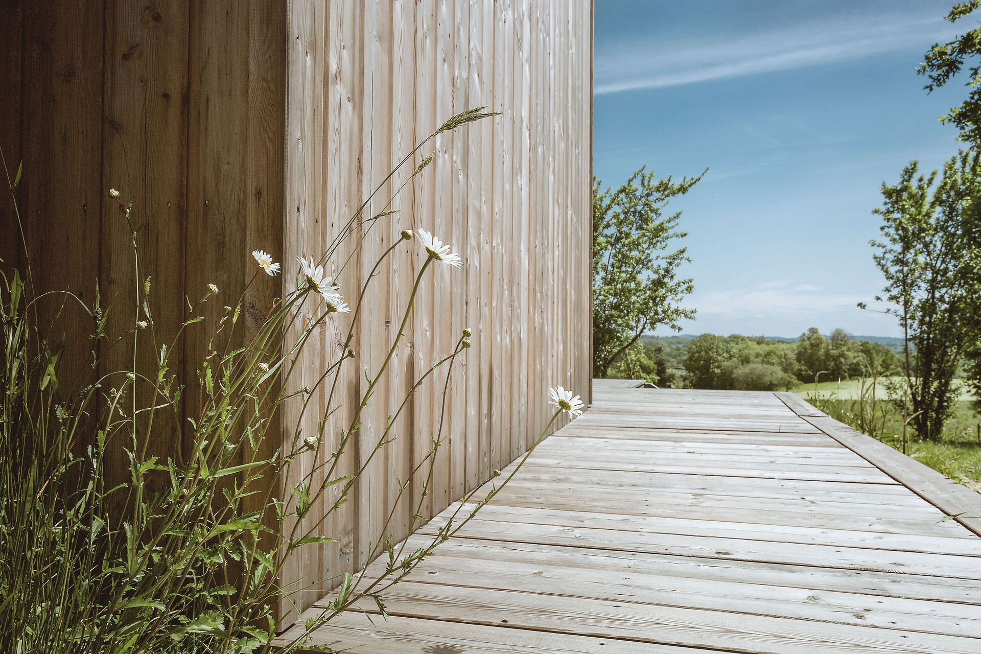 La pièce de vie vitrée est conçue de façon à ce que de l’intérieur vous puissiez baigner dans la nature extérieure. Avec 47 m2 de plancher en bois, elle donne directement sur la terrasse sous les arbres et dans le jardin (3 marches).