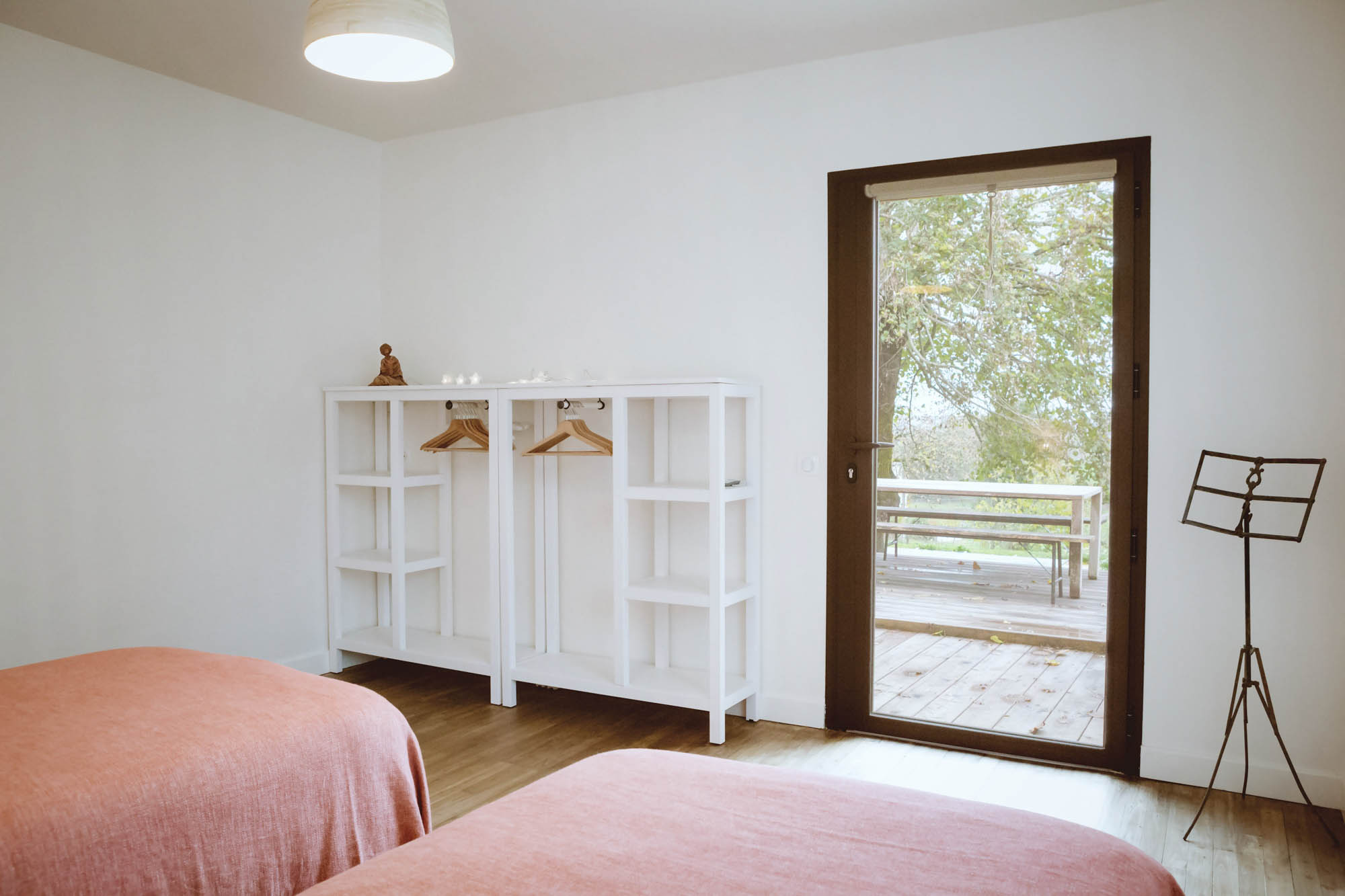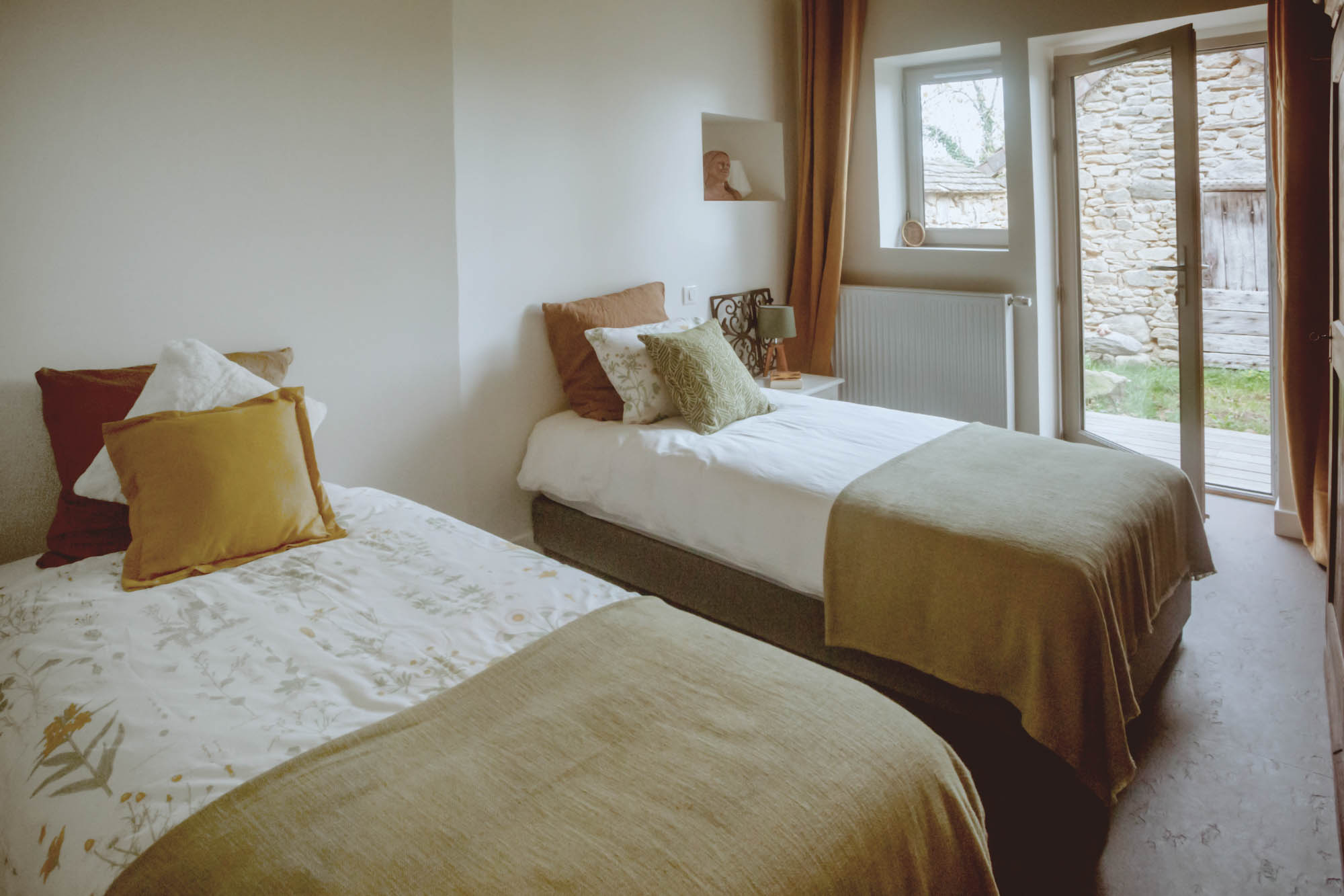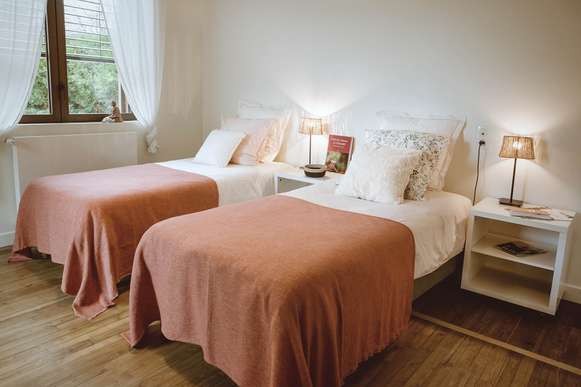 Douce et lumineuse, cette chambre pour 2 personnes, aux normes PMR, d’une surface de 15.50 m2, s’ouvre directement sur la terrasse et permet un accès de plain pied à la cuisine, à la pièce de vie, au séjour du gîte. Elle est équipée de 2 lits simples de 90/190 de qualité hôtelière que l’on peut rapprocher par un système spécial, et les transformer ainsi en un lit king size de 180/190. Ses tables de nuit sur roulettes et ses rangements modulables permettent de s’adapter à tout besoin.