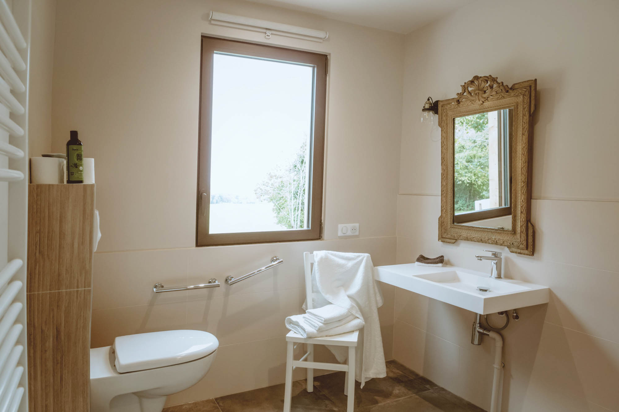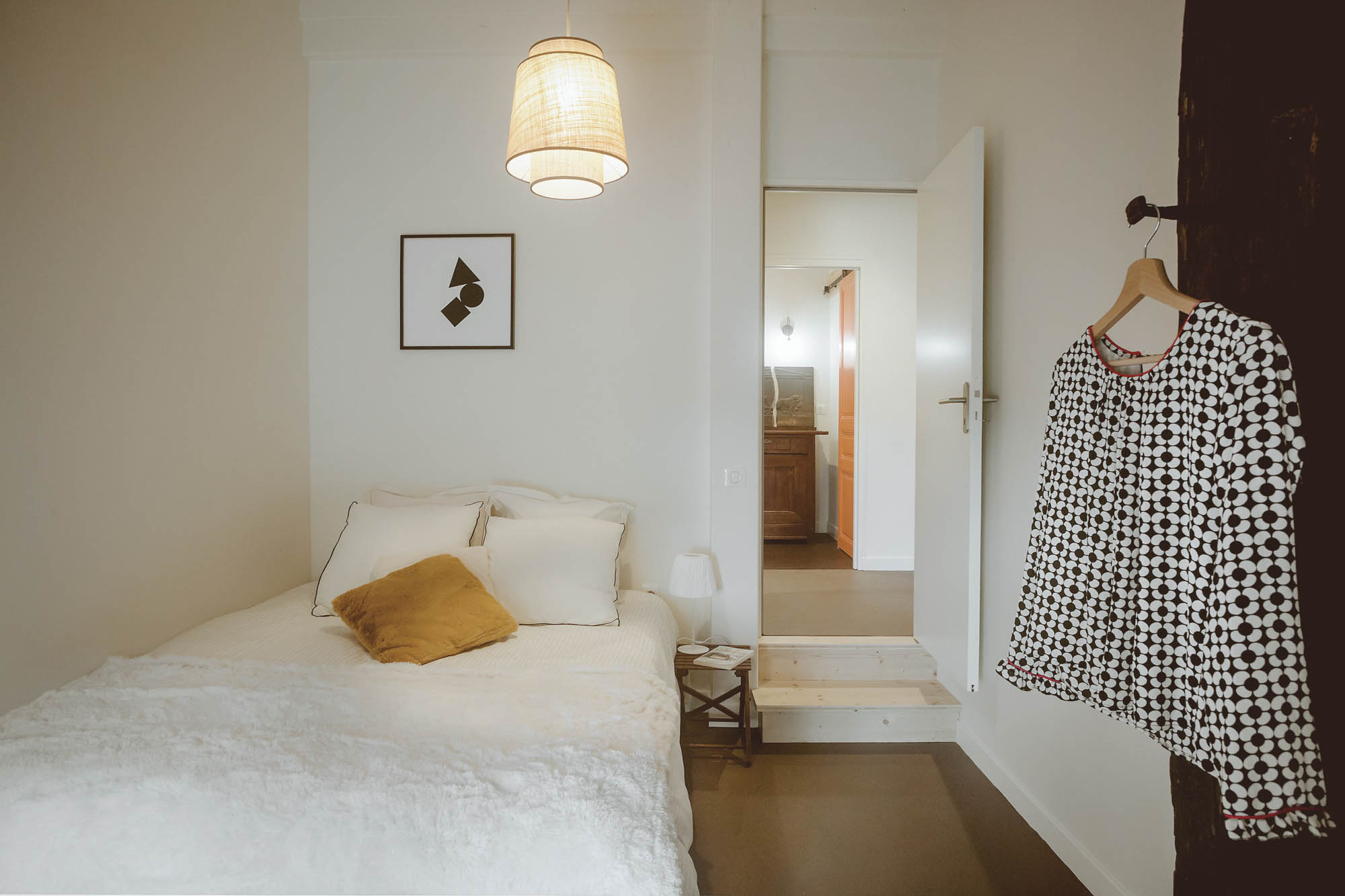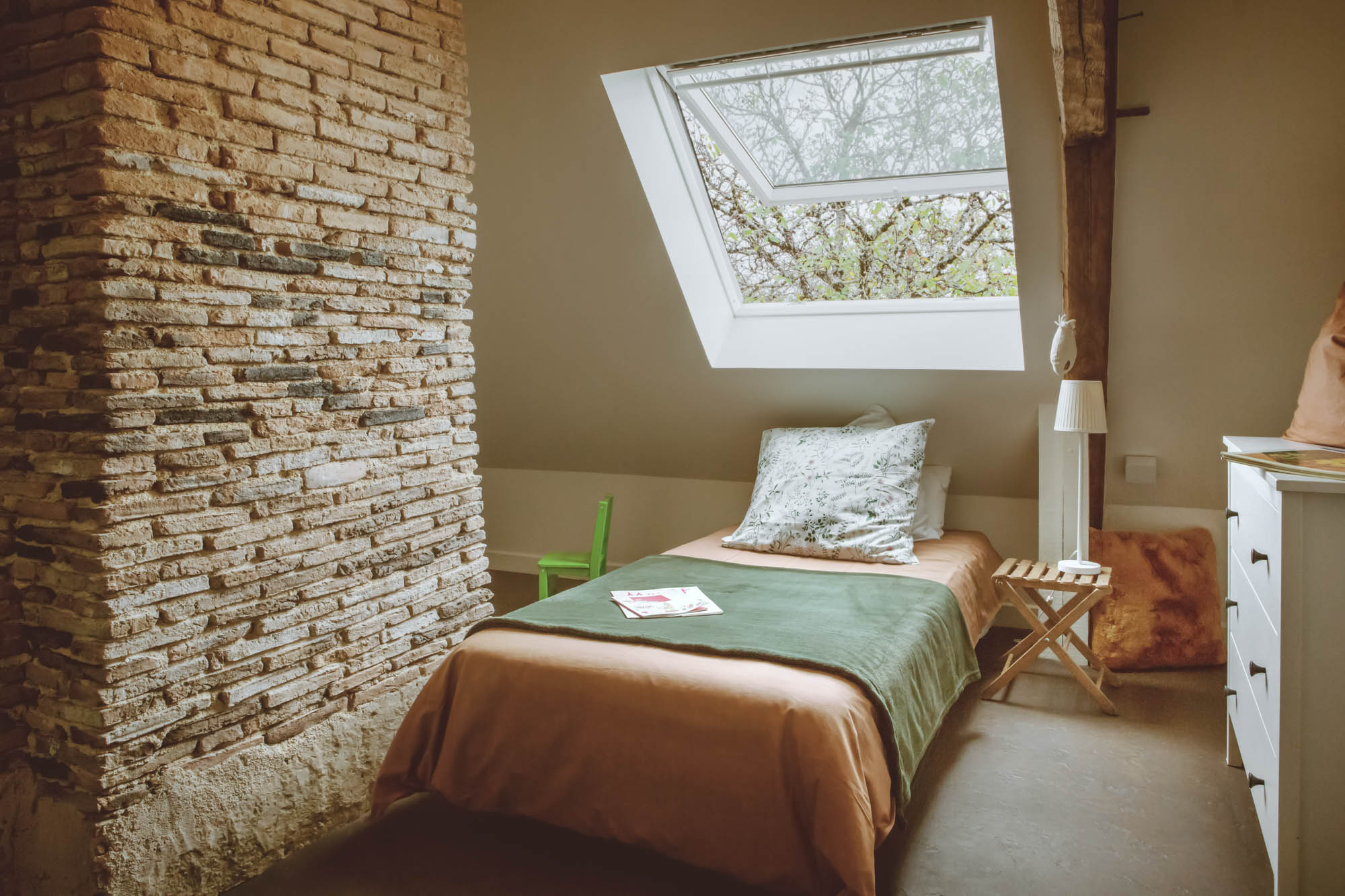 Douillette, cette chambre s’ouvre sur la campagne environnante et propose une vue très agréable sur les canopées du noyer et du tilleul du jardin. Elle est accolée à une jolie petite salle de bain qui comprend une douche de 90/120 ainsi que des toilettes séparées.
