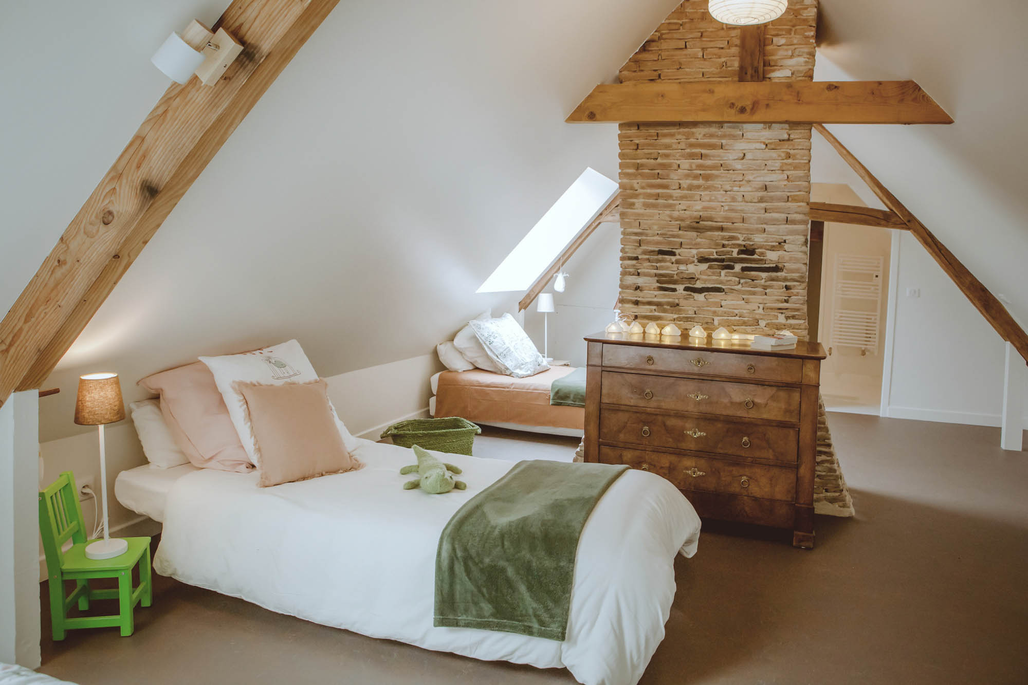 Une grande chambre sous les combles, aménagée pour 4 personnes, peut se moduler en chambre familiale avec 1 grand lit et 2 lits simples - ou en espace de couchage pour 4 amis, stagiaires ou collègues. 2 lits peuvent être rapprochés ou séparés (cf système hôtelier) et un autre peut être plié s’il n’est pas utilisé. Un lit parapluie peut aisément être rajouté dans l’espace.