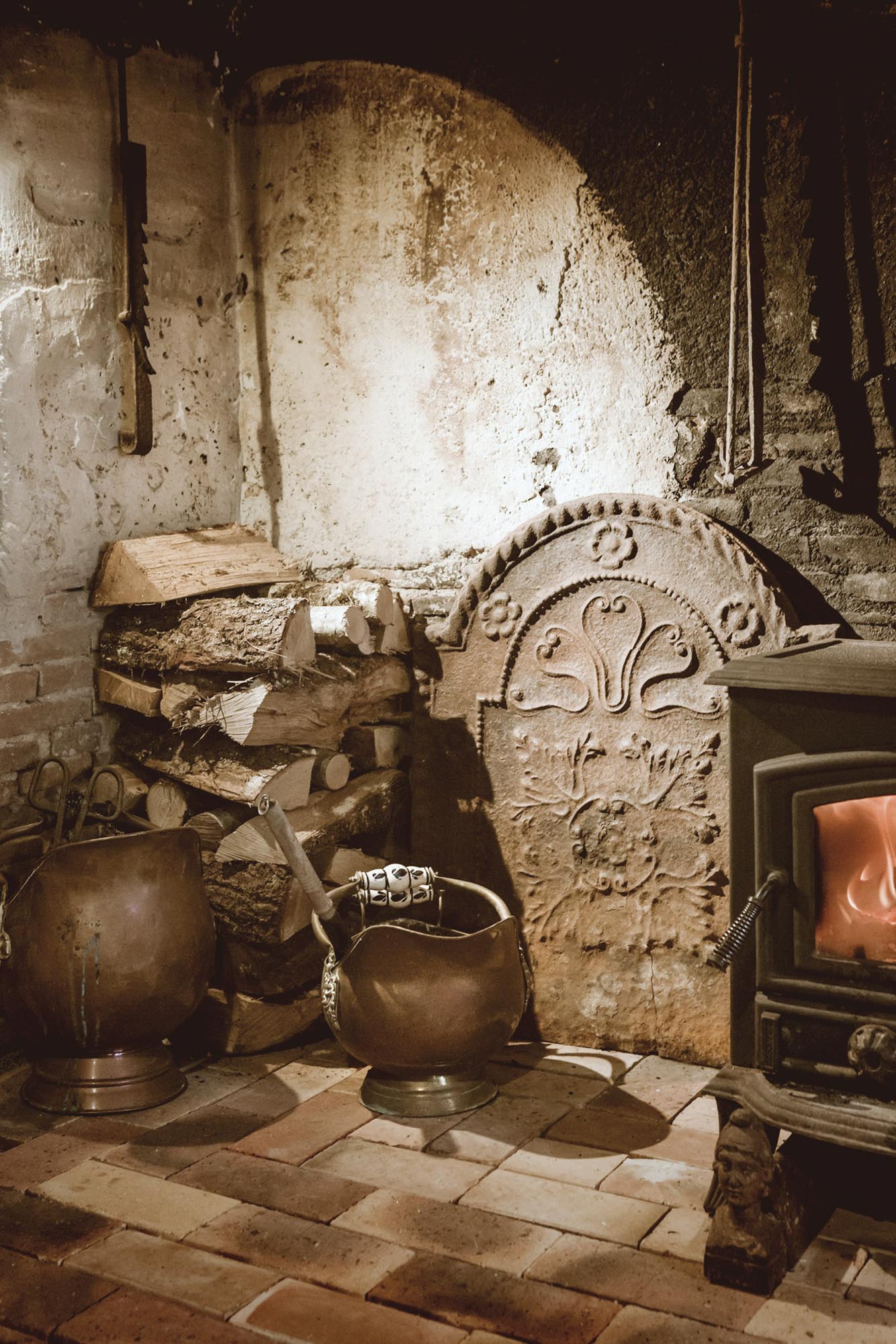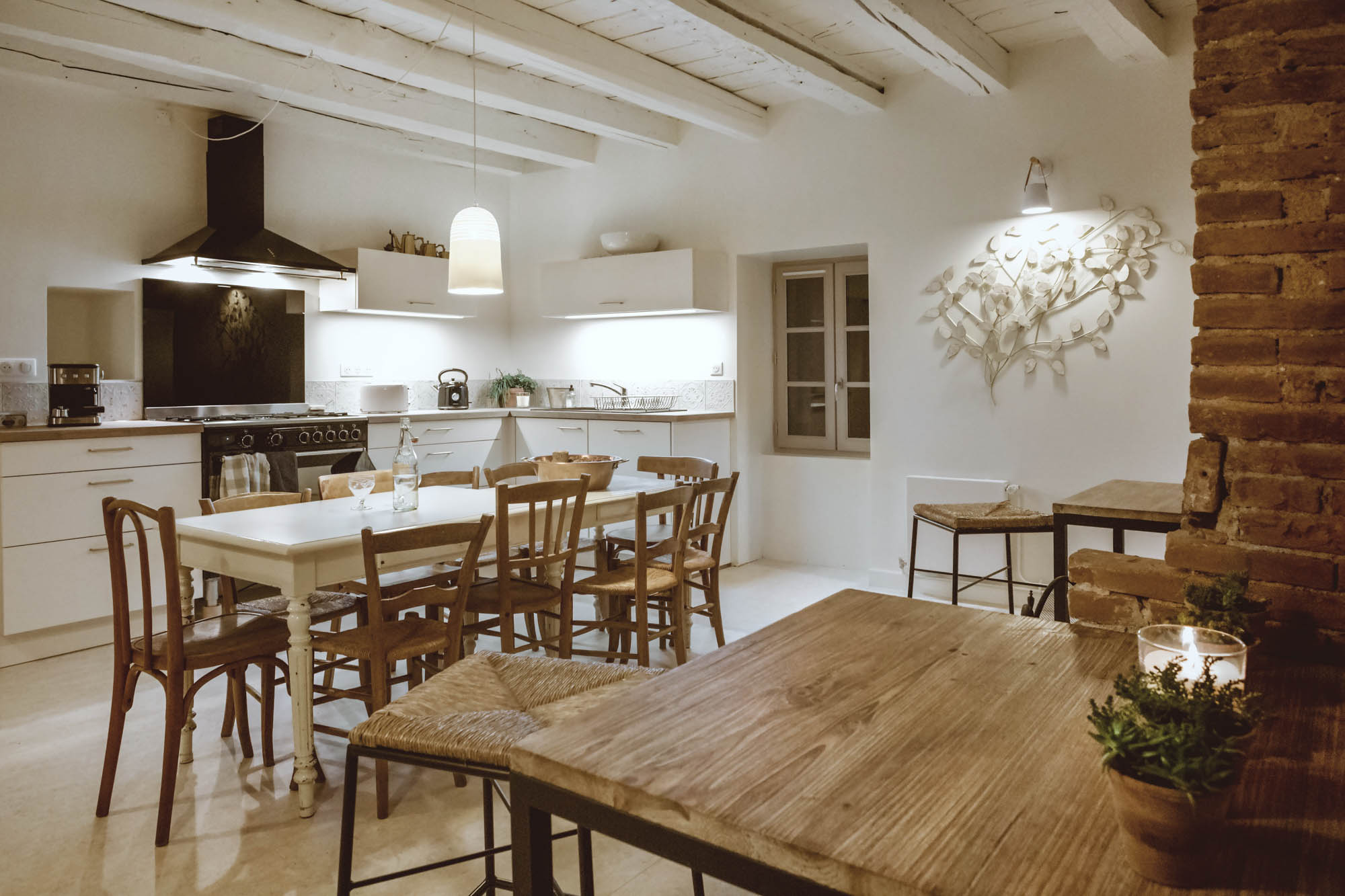 La cuisine de 30m2 baigne dans une atmosphère douce et tamisée. Entièrement neuve, elle côtoie les vieux murs repeints et un conduit de cheminée en briques manufacturées dans les anciennes briqueteries locales. Son piano 5 feux et son four appellent aux mets généreux et aux plats gourmands.