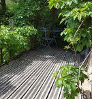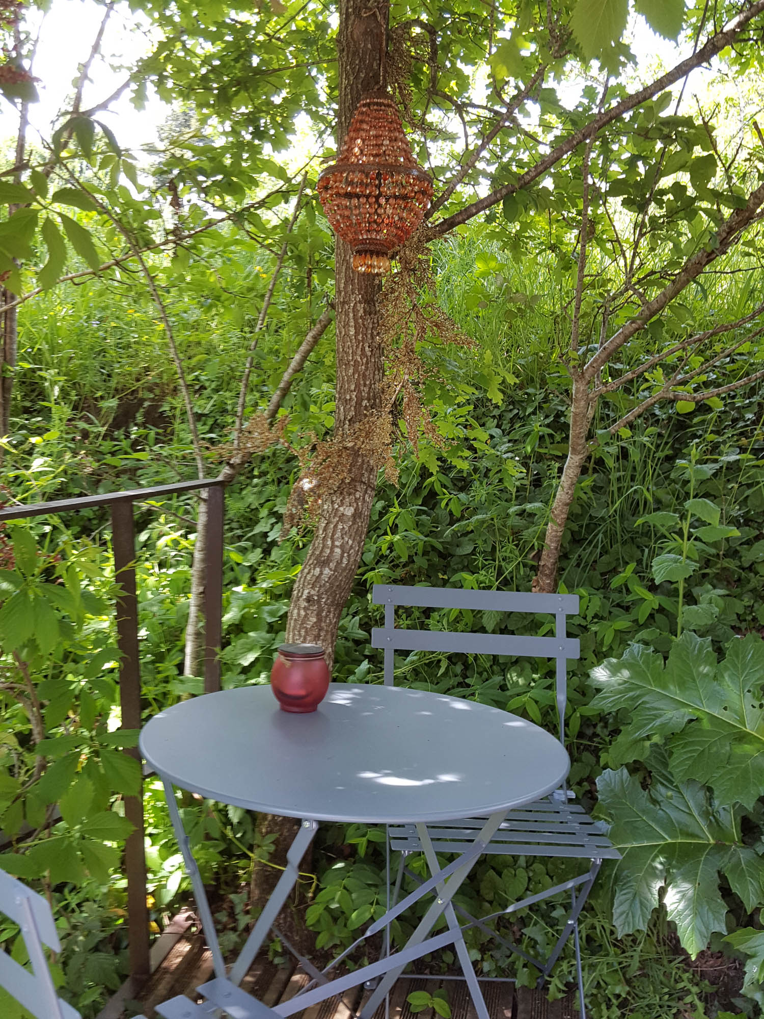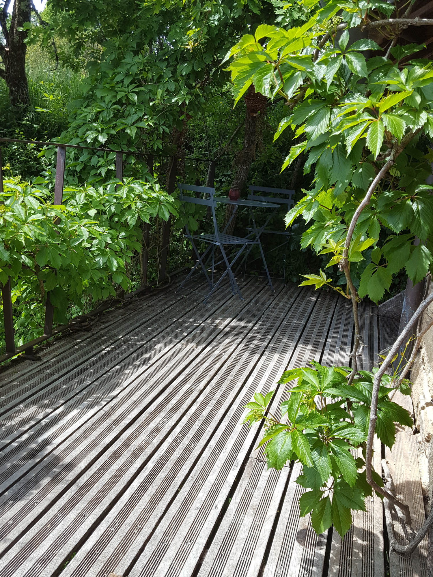 Organisé sur 2 niveaux, il donne accès à 2 terrasses aux intimités différentes. Celle du haut donne directement dans la verdure.