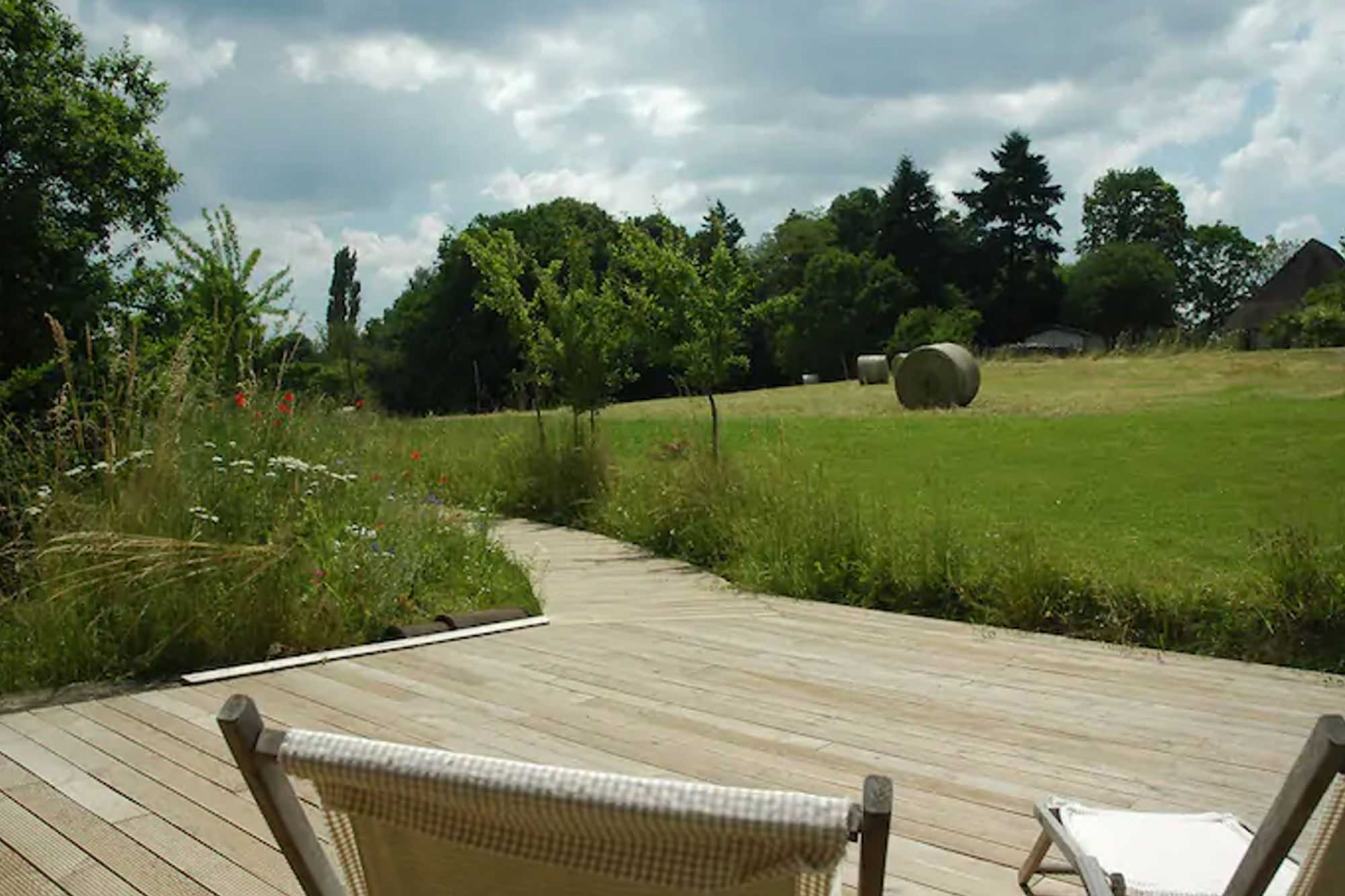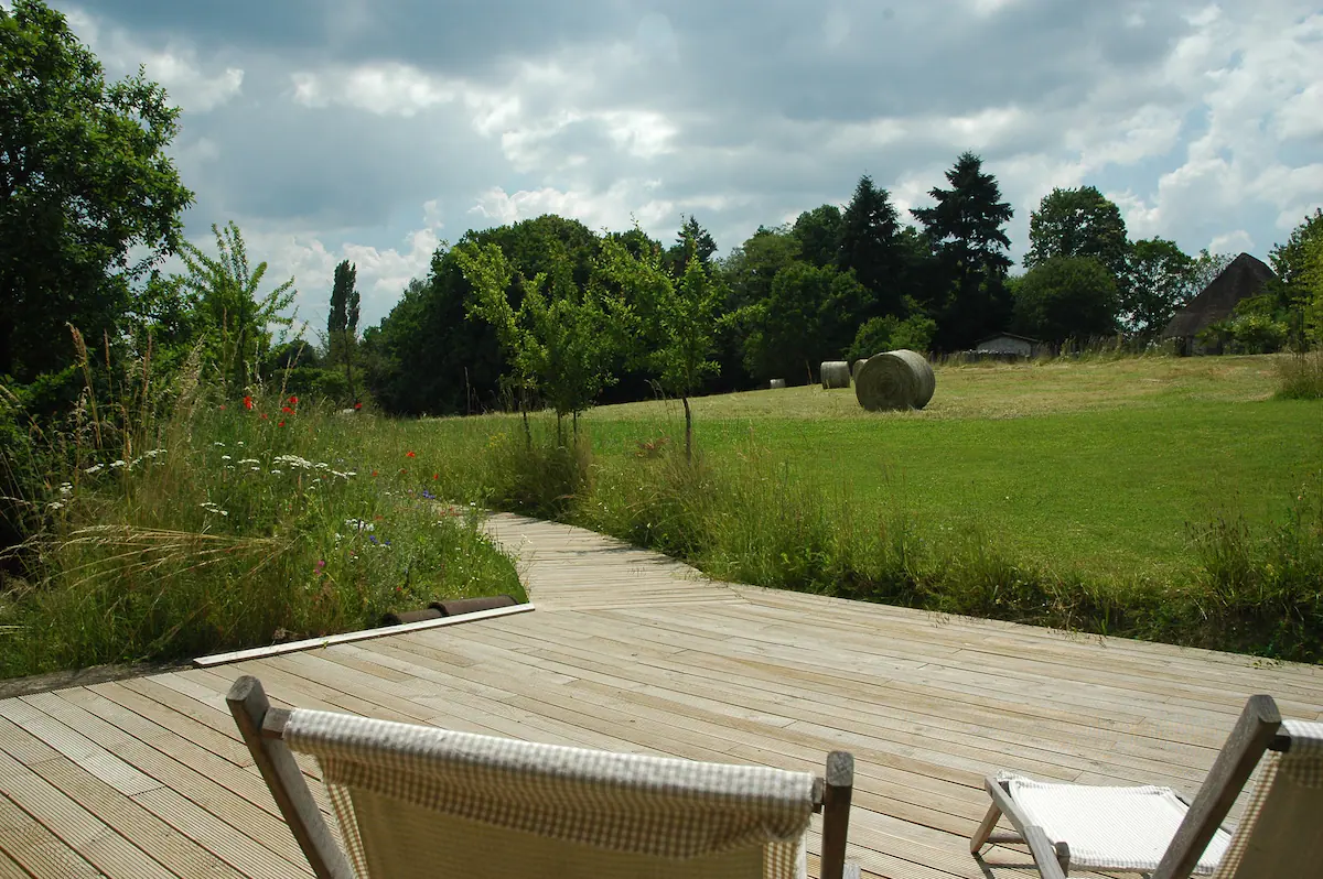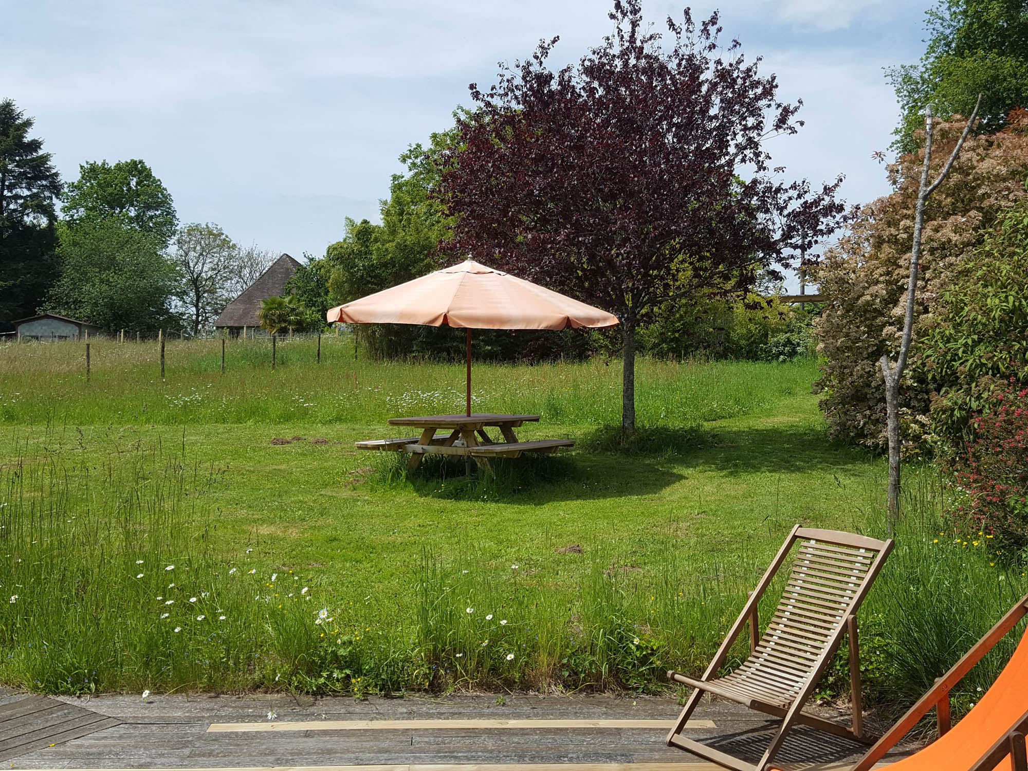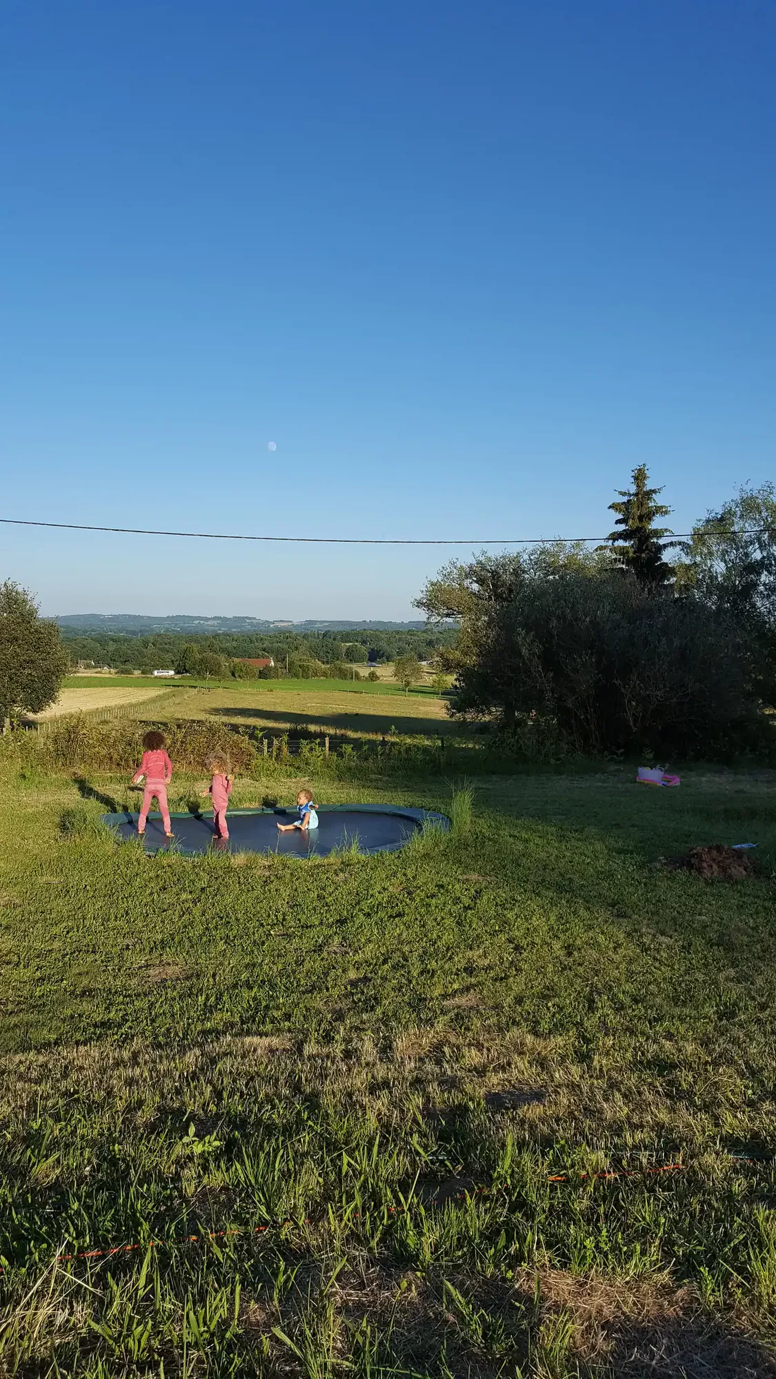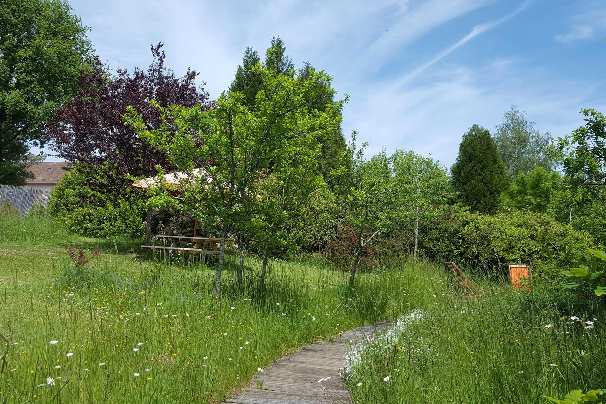 Faites un petit détour au fond du pré pour aller méditer au pied du gros chêne ou contempler la vue depuis le trampoline... avant d'aller savourer un bon barbecue sous le prunus !